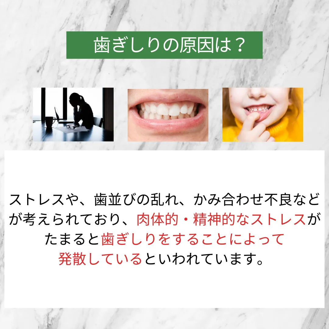 ①ストレスや不安感:日常生活でのストレスや不安が、無意識のうちに歯ぎしりを引き起こすことがあります。特に夜間に緊張が強い場合に発生することがよくあります。