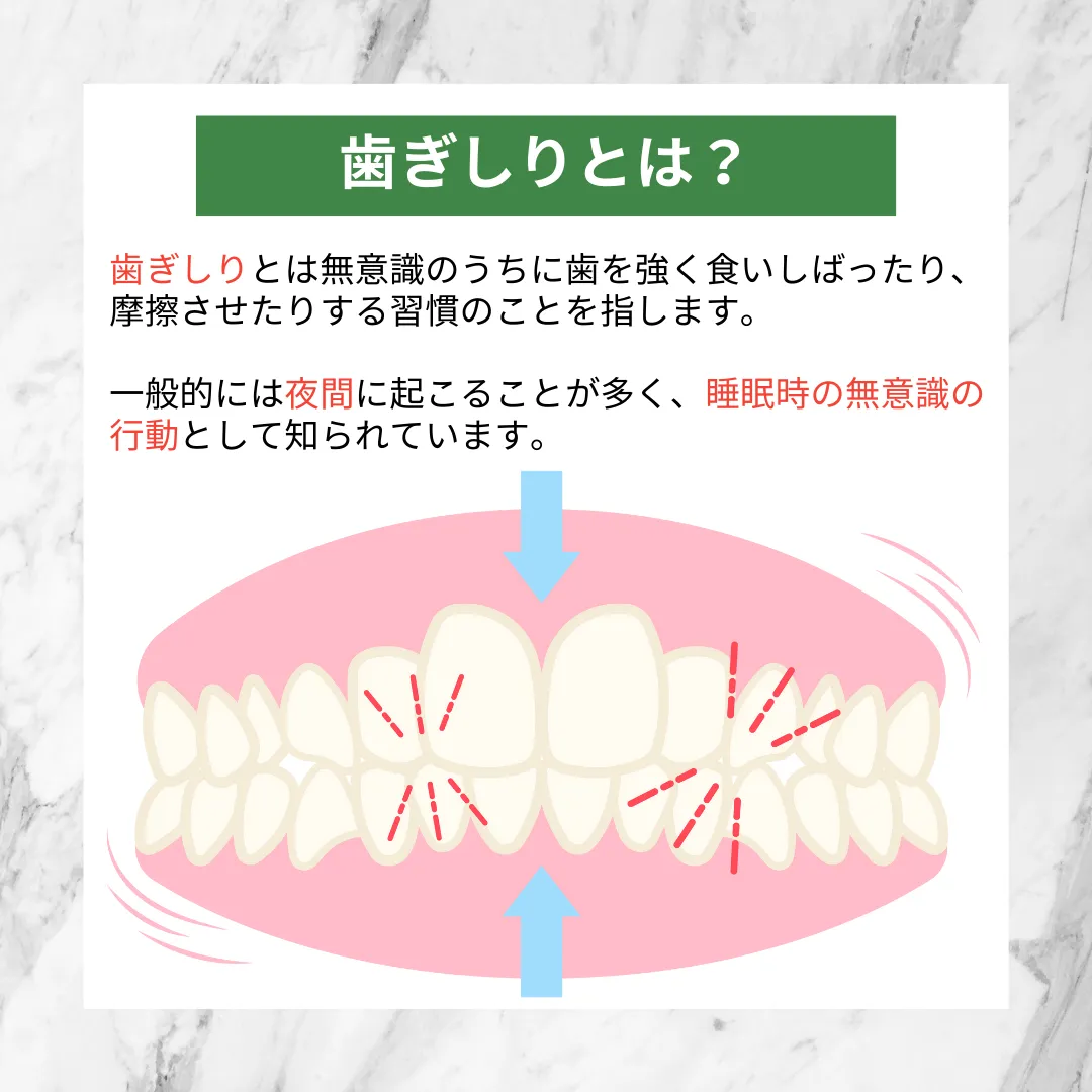 歯ぎしりとは、無意識のうちに歯を強く食いしばったり、摩擦させたりする習慣のことを指します。一般的には夜間に起こることが多く、睡眠時の無意識の行動として知られています。