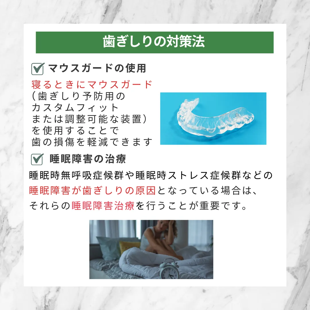 ・マウスガードの使用:歯科医師が作成したマウスガードを使用することで、歯ぎしりによる歯の損傷を防ぐことができます。