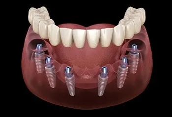 顎全体に一連の歯科インプラント(通常は約4〜6本)を配置することで、すべての歯をインプラントに置き換えることができます。固定性または取り外し式の人工歯を装着します。