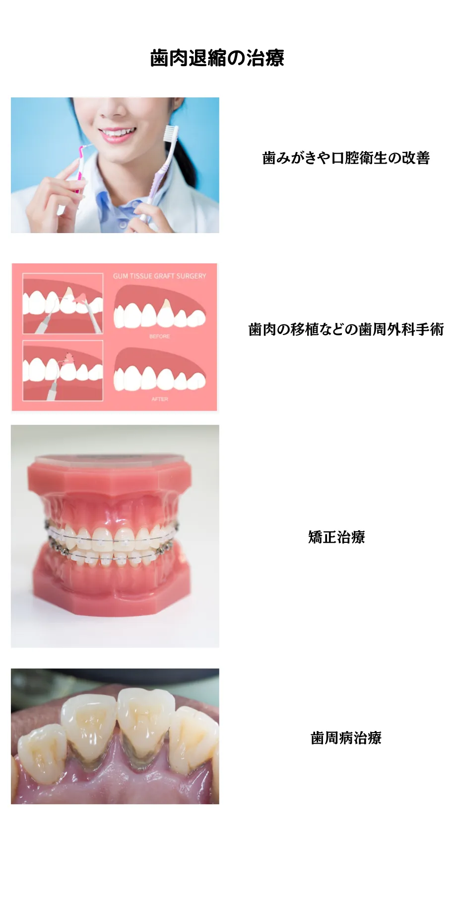 歯肉退縮の治療法は、その原因や進行具合によって異なる場合があります。 以下に一般的な歯肉退縮の治療法をいくつか紹介しますが、最適な治療法を決定するためには、歯科医との相談が必要です。