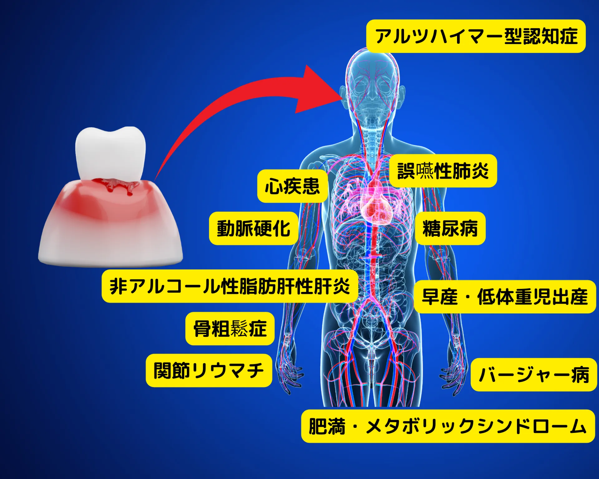 最近の研究によれば、歯周病と多くの全身疾患との間に関連性が示唆されています。以下に、歯周病といくつかの全身疾患の関連性をいくつか挙げてみましょう。